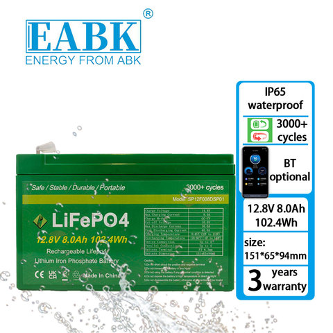 EBAK Batterie Rechargeable 102,4 Wh Alimentation de stockage d'énergie solaire portable 12.8V 8,0 Ah Lifepo4 Batterie lithium-fer-phosphate