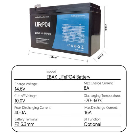 סוללה ebak נטענת 102.4wh כוח אחסון אנרגיה סולארית נייד 12.8v 8.0ah lifepo4 ליתיום ברזל פוספט